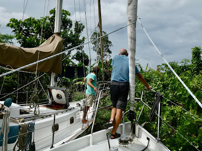 Bijna elke ochtend gaan Liza en ik, twee helden op sokken, met de dinghy op pad. De waterdichte tas is gevuld met fotocamera’s, mobiele telefoons, een verrekijker en een marifoon. Zo staan we altijd in contact met de heren, mocht het een keer echt goed misgaan. We laten de motor van de dinghy op de boot achter en gaan op de stroom verder de kreek in. We horen van alles, maar zien niets. Dan, op nog geen 20 meter van ons vandaan, een enorme plons. We kijken elkaar aan. Shit, wat is dit nu... Om beter te kunnen observeren, knopen we de dinghy aan een boomstam vast en vliegen er wel tien vleermuizen weg; dat was effe schrikken en we moeten om onszelf lachen. We horen boomtakken knappen… Apen? We voelen ons aardig bekeken. Zij zien ons, maar wij hen niet. De tijd vliegt om en we zijn al een tijdje weg. De vloedstroom blijft maar komen. Er zit niks anders op dan tegen de stroom in te peddelen. Gelukkig lukt dat en komen we veilig en bezweet aan op de twee moederschepen. We twijfelen of we nog wel een plons durven te nemen, maar het verkoelende water lonkt en we springen erin. Een dinghytocht is een leuke afwisseling, omdat we met onze zeilboten altijd tegen de wind in moeten motoren en daardoor lawaai maken.